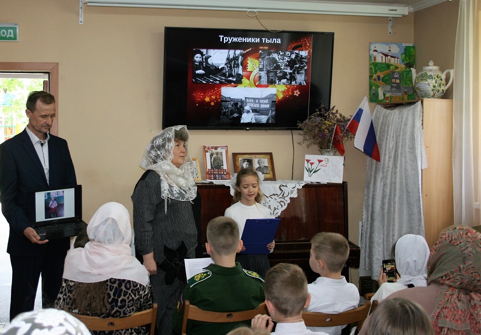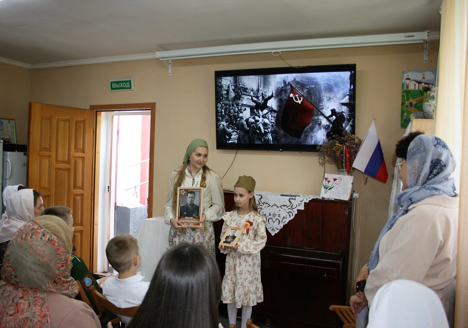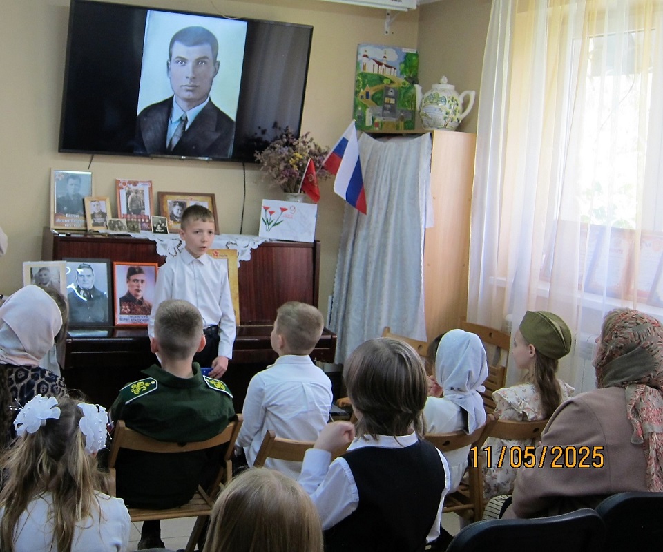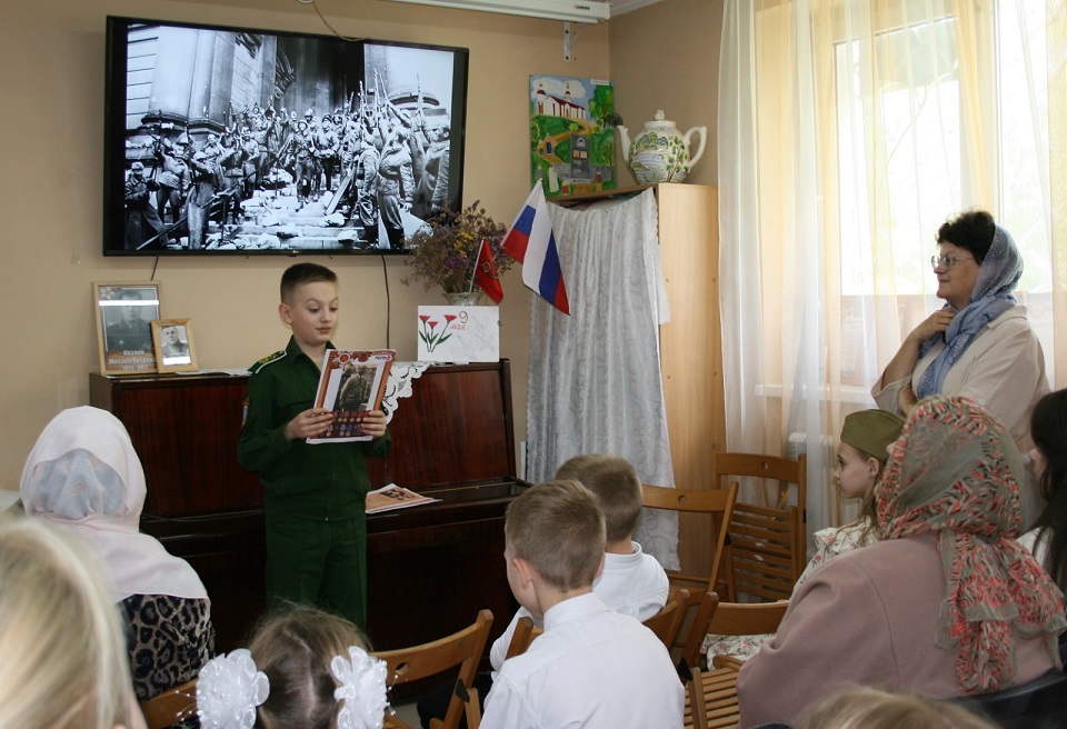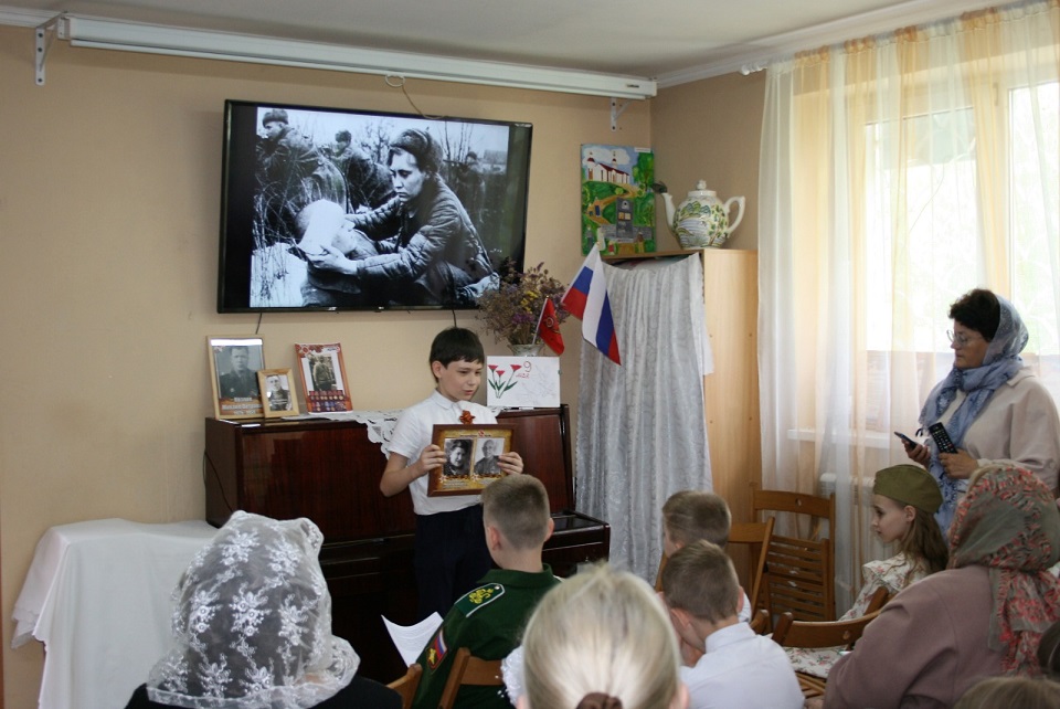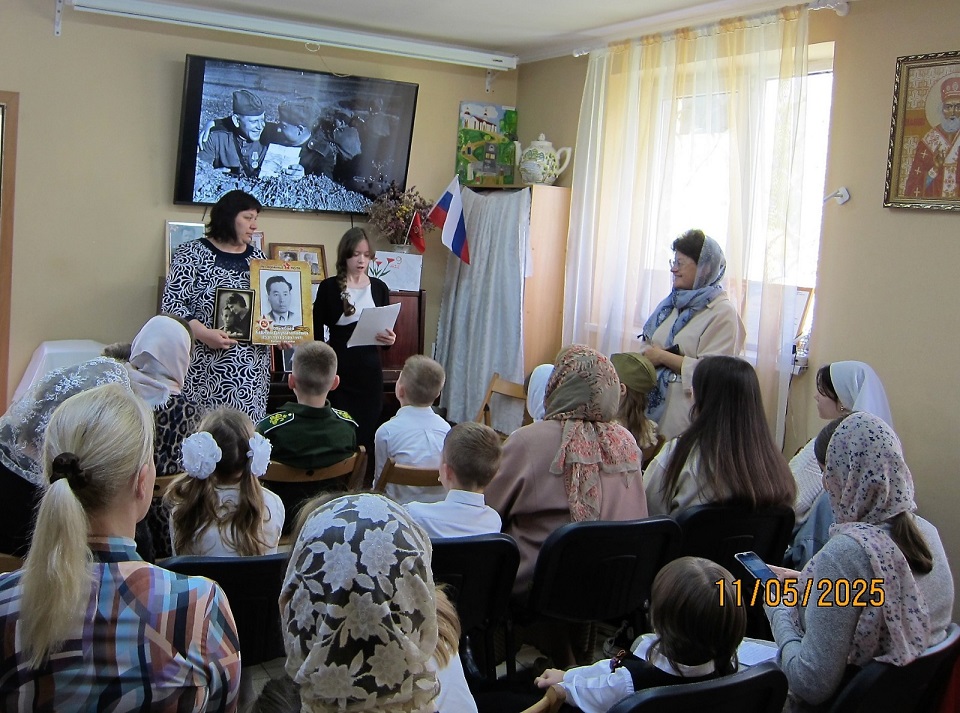 Дети вместе с родителями предварительно проделали большую поисковую работу для подготовки к меропритию. На урок они пришли с портретами своих дедушек и бабушек и их наградами. Дети вместе с родителями рассказывали об историях героев своей семьи во время Великой Отечественной войны. Были использованы фото и видео материалы. Ученица Малаханова Мария прочитала очень трогательное стихотворение Лора Тасси "Дети войны", которое не оставило никого равнодушным. В завершение все присутствовавшие на мероприятии пели песни военных лет в музыкальном сопровождении игры на баяне преподавателя воскресной школы и певчего храма Губского Валерия Николаевича. Атмосфера на уроке была очень душевной, рассказы детей и их родителей - искренними, вызывающими живой интерес у всех присутствующих.