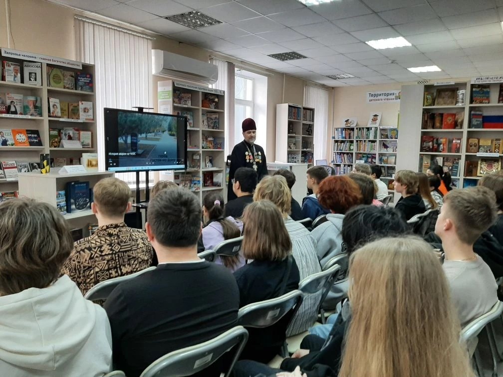 16.04.2026г. настоятель храма Великомученика и Целителя Пантелеимона митрофорный протоиерей Анатолий Комар в предверии 40-й годовщины аварии на Чернобыльской атомной электростанции провел "Урок мужества" для учащихся Авиационного колледжа г. Ростова-на-Дону. Мероприятие прошло в помещении библиотеки им. Ломоносова Первомайского района нашего города. Священник рассказал о тех трагических событиях и героическом подвиге ликвидаторов-чернобыльцев в борьбе с последствиями техногенной катастрофы.